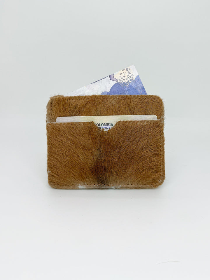 Portadocumentos en cuero peludo café claro. Este portadocumentos tiene un bolsillo al frente, dos bolsillos al respaldo y abertura para billetes en la mitad.