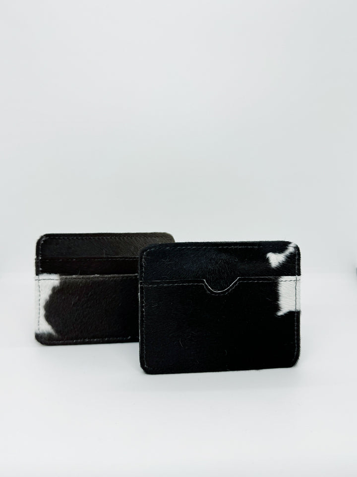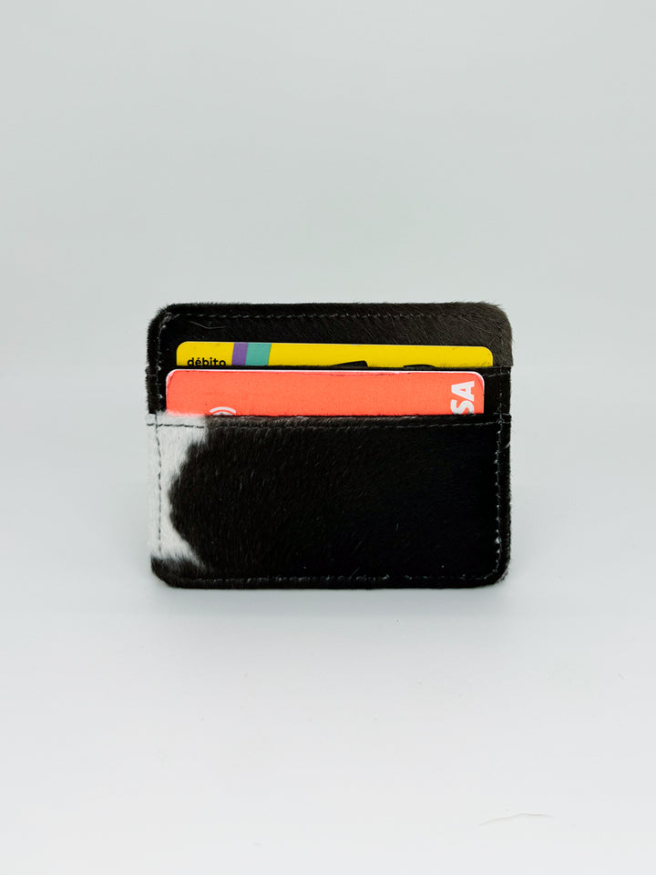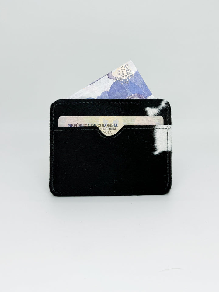 Portadocumentos en cuero peludo blanco y negro. Este portadocumentos tiene un bolsillo al frente, dos bolsillos al respaldo y abertura para billetes en la mitad.