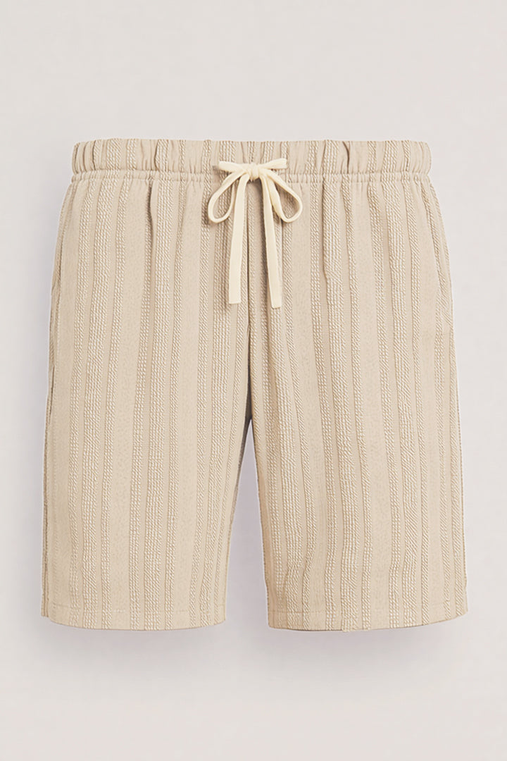 Short tejido en algodón beige, el tejido de esta prenda hace que se vea con rayas verticales trenzadas. Tiene resorte y cordón en cintura. Bolsillos laterales y un bolsillo posterior.